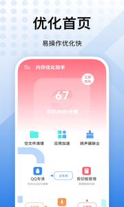 内存优化助手是一款操作便捷、功能多样的手机优化软件。一键优化功能可以有效测试当前手机状态,空文件夹清理功能可以有效清除手机中残留的空文件,轻松释放手机内存,告别手机卡顿现象;除此之外,QQ清理、剪切板管理、应用加速、扬声器除尘等功能都能有效帮助用户提升手机运行效率,提供上佳的用户体验。