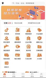 优客易采app拥有抖音,快手,企业查询,附近客源,地图客源,客源等多项功能,让您更有效的获取所需要的客源。
