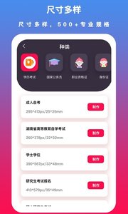 1,多种证件照规格:支持一寸、二寸、小一寸、小二寸、学历考试、证、旅游签证、语言考试、IT认证、公务员、财务会计、建筑工程、医药卫生、驾驶证等各种证件照需求场景的拍摄。